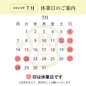 【7月】休業日のご案内 投稿日: 2025年6月28日2025年6月28日 投稿者: 飛塚智美 日頃より弊社剪定鋏をご愛用いただきまして誠に有難うございます。 7月の休業日は下記の通りです。 20日・21日・22日は三連休となります。 ご足労なきよう、何卒よろしくお願い申し上げます。 ※今年より月曜・土曜の不定休がございます。 ※臨時休業の情報は、弊社インスタグラム にてご案内しております。