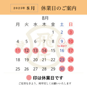 休業日:8月10日(土・祝)~14日(木) ※9日は16時まで